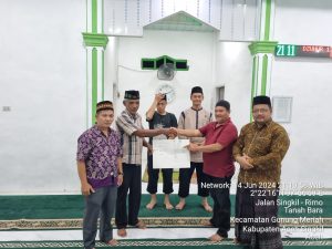 Gunung Meriah – Kantor Urusan Agama Kecamatan Gunung Meriah menyelenggarakan Ikrar Wakaf dan Penandatanganan Akta Ikrar Wakaf atas sebidang tanah yang berada di Desa Tanah Bara Kecamatan Gunung Meriah seluas 1021 m2 yang di atasnya telah dibangun sebuah Mushalla, Jum’at (14/06/2024).