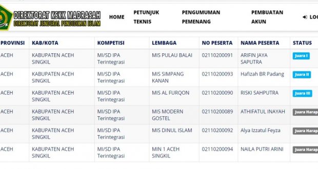 Pulau Banyak — Rasa haru sekaligus bangga. Itulah yang dirasakan oleh keluarga besar MIS Pulau Balai, Kecamatan Pulau Banyak saat ini. Mengapa tidak, Putra terbaik MIS tersebut, yaitu Arifin Jaya Saputra, berhasil meraih Juara 1 Bidang IPA Terintegrasi pada Seleksi Kompetensi Sains Madrasah (KSM) , tingkat Kabupaten Aceh Singkil, Sabtu (28/8).
