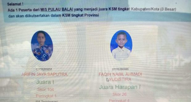 Selain Arifin , siswa MIS Pulau Balai lainnya atas nama Faqih Nabil Ahmadi Yudistira juga meraih prestasi sebagai juara Harapan 1 KSM untuk bidang studi Matematika Terintegrasi