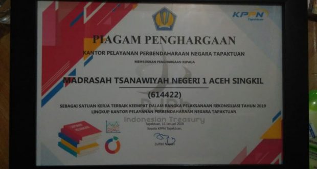 “Penghargaan yang sangat luar biasa diterima oleh Satker MTsN 1 Aceh Singkil, dengan kategori Rekonsilasi tepat waktu. Penghargaan itu diserahkan langsung Pihak KPPN Tapaktuan,” kata Rudi, di Tapaktuan, Kamis (16/01/2020).