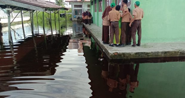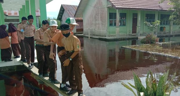 Singkil (adn) – Suasana Proses Belajar Mengajar (PBM) di Madrasah Tsanawiyah Negeri (MTsN) 1 Aceh Singkil kali ini sedikit berbeda, dikarenakan banjir menggenangi halaman madrasah, Jum’at (21/5/2021)